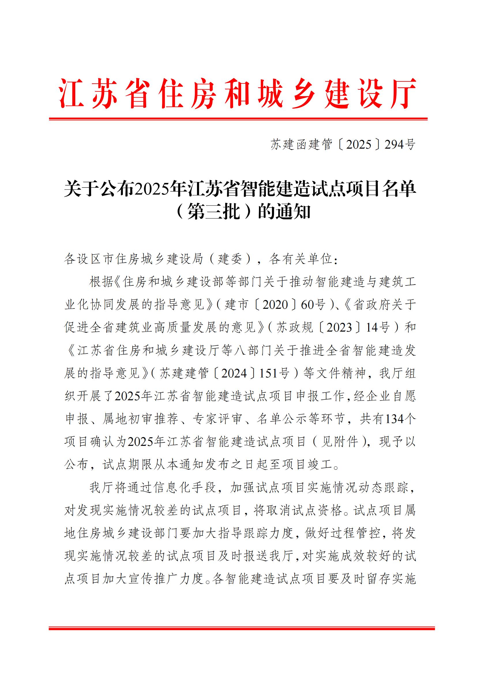 近日,江蘇省住房和城鄉(xiāng)建設(shè)廳正式公布了2025年度江蘇省智能建造試點項目名單(···